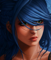 7) Внешность: Довольно симпатичная девушка с ярко-синими волосами чуть ниже плеч и насыщено зелеными глазами. Любит простую одежду, даже в какой-то степени мальчишеский стиль. Любитель различных мелких аксессуаров: шляп, ремней, сережек, браслетов. Самые любимые цвета: красный, зеленый и черный. Именно их и придерживается в одежде.